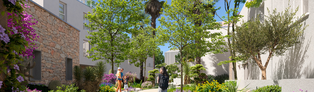 C'est dans ce cadre idéal que la résidence Ischia dévoile une architecture sobre, élégante et aérienne, agencée autour d'un cœur d'îlot végétal, qui respecte le contexte local (toiture tuile en pente, pierre en sousbassement, façades aux enduis clairs...), sans délaisser pour autant le bien-être contemporain (toits terrasses accessibles, jardin commun en pleine terre, volets coulissants persiennés...). Avec ses proportions équilibrées et sa matérialité durable, Ischia pose les bases d'une architecture intemporelle.